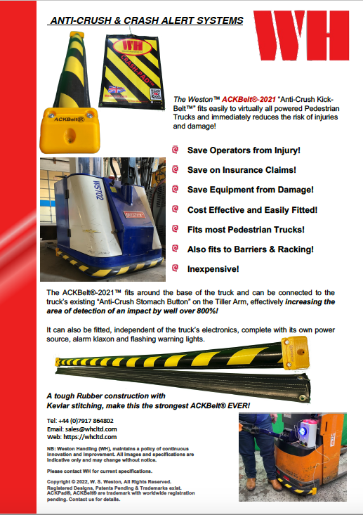 Forklift Truck Safety Pads just got a whole lot better, now the ACKBelt®Crash-Pad™ is here! Your Fork Truck safety and plant safety can be improved dramatically, by fitting an ACKBelt®Crash-Pad™ in just a few minutes!